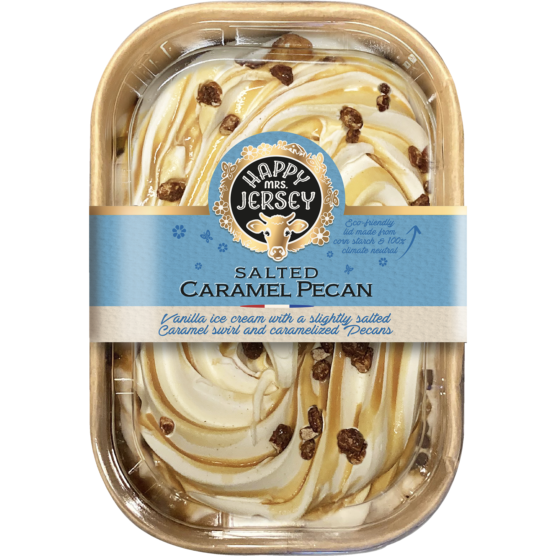 Indulge in the ultimate taste experience with Happy Mrs Jersey Bio! Vanilla ice cream with a lightly salted caramel swirl and caramelised pecan pieces, creating the perfect blend of sweetness and crunch. A delightful and luxurious flavor that will captivate you!