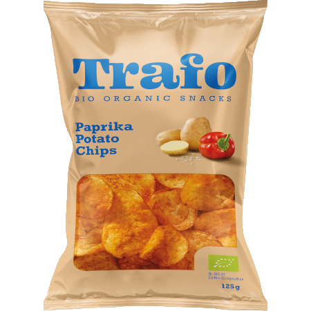 Βιολογικά χειροποίητα πατατάκια με πάπρικα. Η Trafo παράγει ένα ευρύ φάσμα αλμυρών σνακ σε υπερσύγχρονες γραμμές παραγωγής με εξειδικευμένο προσωπικό για πάνω από 30 χρόνια .Για τα τσιπς της επιλέγονται υψηλής ποιότητας πατάτες βιολογικής γεωργίας,οι οποίες κόβονται σε λεπτές φέτες και στην συνέχεια ψήνονται σε χαμηλή θερμοκρασία χωρίς πρόσθετα κρατώντας έτσι την περιεκτικότητα σε λιπαρές ουσίες στο ελάχιστο.