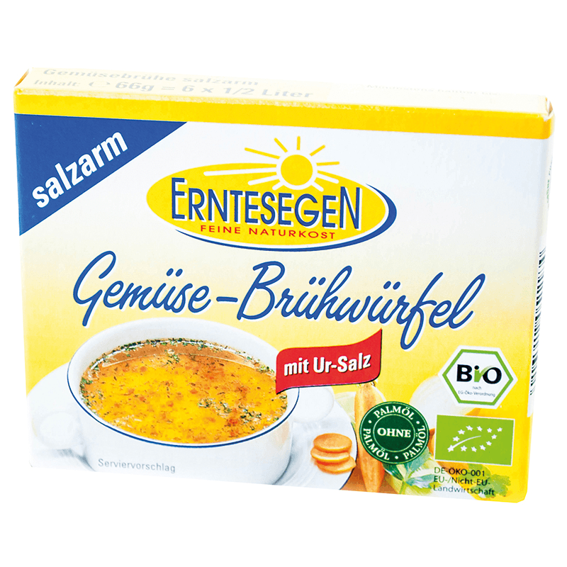 Κύβοι ζωμού λαχανικών χαμηλής περιεκτικότητας σε αλάτι από συστατικά βιολογικής γεωργίας. Ιδανικοί για το μαγείρεμα, καρύκευμα για βραστά, σούπες, σάλτσες και πολλά άλλα πιάτα. Δεν περιέχουν γλουτένη, λακτόζη, χρωστικές και συντηρητικά ή τροποποιημένο άμυλο.