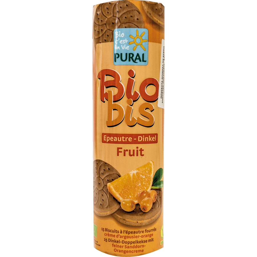 Bιολογικά μπισκότα από αλεύρι ντίνκελ με γέμιση πορτοκάλι και ιπποφαές, χωρίς προσθήκη αυγού ή γαλακτοκομικών από την Pural.
