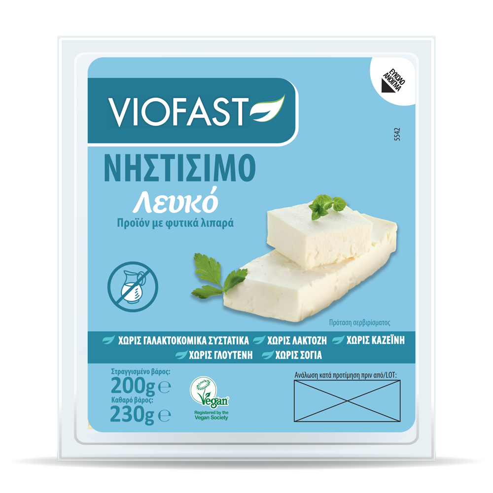 Το Viofast λευκό με γεύση παραδοσιακής ελληνικής φέτας, παράγεται με λάδι καρύδας και δεν περιέχει γαλακτοκομικά συστατικά, λακτόζη, σόγια και γλουτένη. Είναι ιδανική επιλογή για νηστίσιμη χωριάτικη σαλάτα, κρύα σάντουιτς, τοστ, πίτες καθώς και νηστίσιμες συνταγές κατσαρόλας και φούρνου.